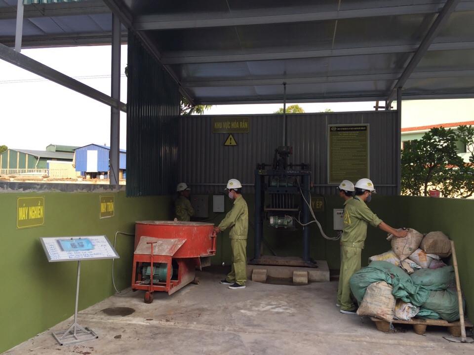 Hệ thống hóa rắn công suất 10 tấn/ngày: Phối trộn các chất cần hóa rắn (tro xỉ hoặc bùn thải, thủy tinh vụn, xà bần) với các chất phụ gia khác trước khi đổ khuôn thành những khối rắn.